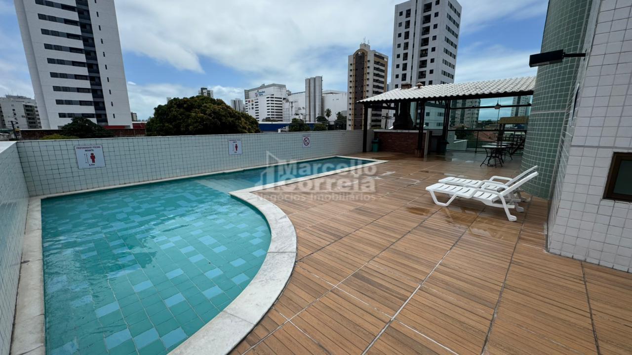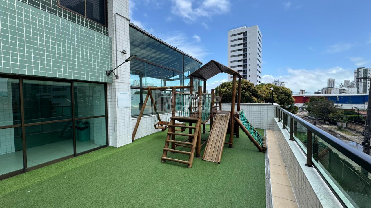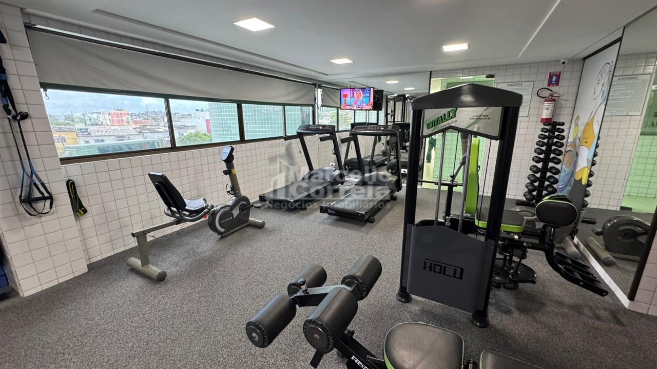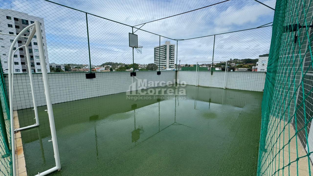 Edifício com sala de ginástica, campinho de futebol, piscina, playground e área gourmet com forno de pizza e churrasqueira.